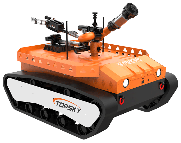履帶式防爆機器人底盤采用鋰電池電源作為動力源,使用無線遙控的方式遠距離操控,裝載7自由度排爆機械手能實現不同角度旋轉,機械臂可裝載爆炸物銷毀器,可現場摧毀爆炸物,采用履帶+單擺臂結構,能適應各種地形快速作戰部署。