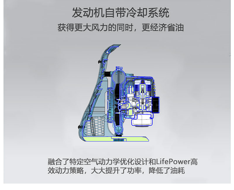 發(fā)動機自帶冷卻系統(tǒng),減少風量的損失,獲得更大風速經(jīng)濟性好,燃油消耗量低;