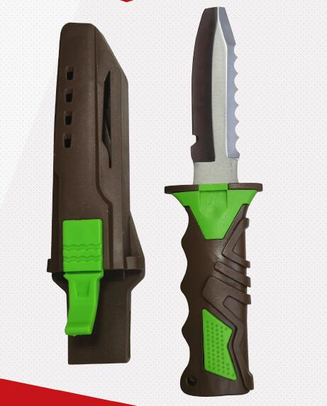 刀背帶鋸齒設(shè)計(jì),帶缺口,無(wú)刀頭,帶快卡扣,硬塑料刀鞘手柄帶護(hù)口。