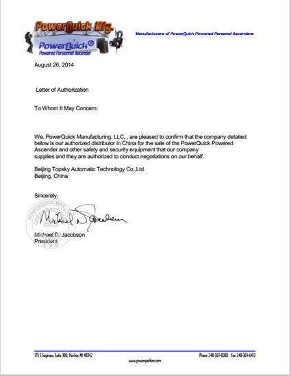 2014年8月26日 ,北京凌天成為 美國Power quick 公司 自動升降機 一級代理