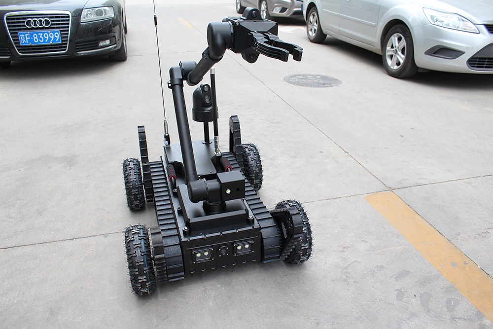 機(jī)械臂部分配備爆炸物銷毀器、瞄準(zhǔn)器,能現(xiàn)場對爆炸物進(jìn)行摧毀;
