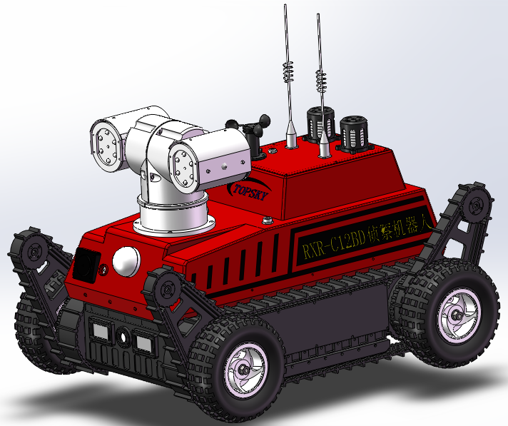 1) 車體★結(jié)構(gòu)型式:采用前后4擺臂+履帶+金屬輪胎的結(jié)構(gòu)形式,最大有效提高前進(jìn)速度、越障性能,同時金屬輪胎可以抗高溫,適合在火區(qū)高溫滅火救援。