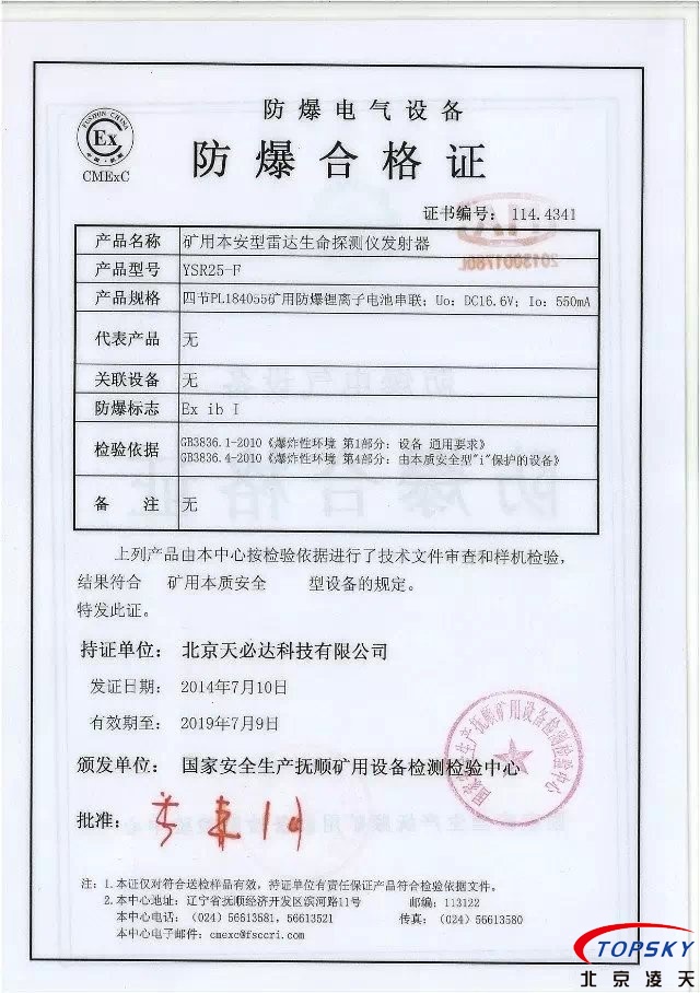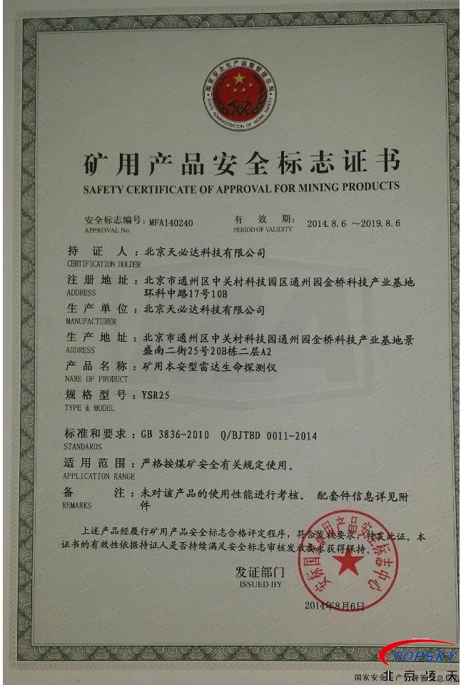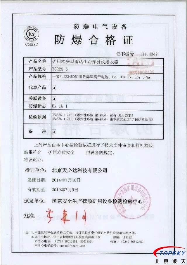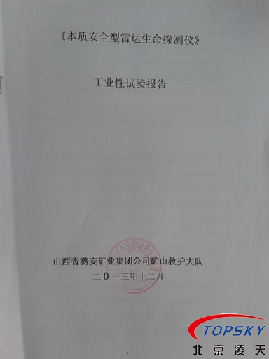 從國家安標(biāo)中心獲悉,YSR25本安型雷達(dá)生命探測儀取得煤安標(biāo)志認(rèn)證(證書見下圖),自此,國內(nèi)本安型可用于爆炸性環(huán)境的探人雷達(dá)取得完整下井資質(zhì),從研制方獲悉,該設(shè)備已在山西陽泉煤業(yè)集團(tuán)救護(hù)大隊、山西潞安集團(tuán)救護(hù)大隊、開灤集團(tuán)救護(hù)大隊進(jìn)行過工業(yè)性試驗,試驗效果良好,探測距離達(dá)到25米(報告見下圖)!