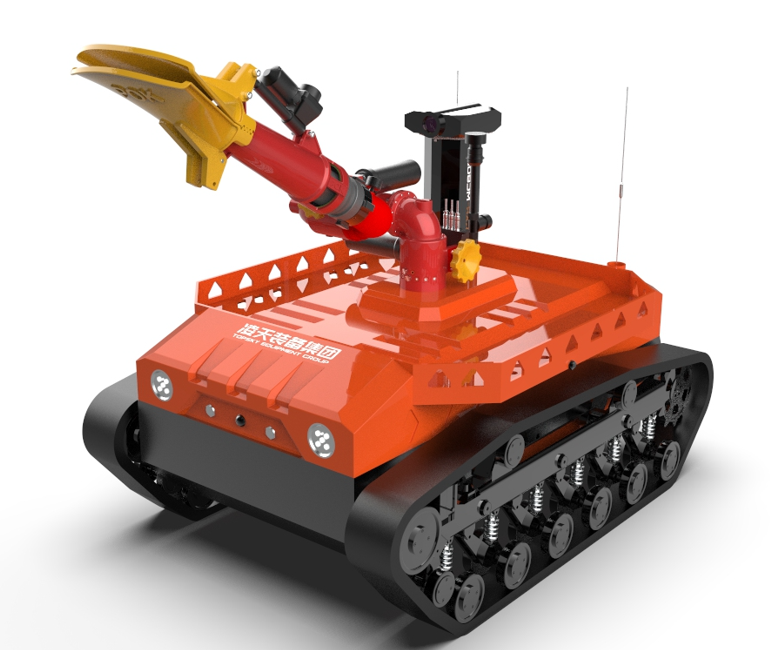機器人采用無線遙控設計,遙控器與監(jiān)視器一體/分離,可實時的顯示電池、內(nèi)部的各種信息,機器人狀態(tài)、現(xiàn)場溫濕度、有毒有害氣體濃度報警信息等控制機器人前進、后退、轉(zhuǎn)向等運動。具備遠程偵察能力,機身搭建升降云臺、高清攝像頭、熱成像攝像頭、氣體傳感器三類環(huán)境感知設備和云臺控制設備,也可聯(lián)動聲光報警模塊提醒消防人員或群眾,有效避免危險。在通過遠程偵察手段有效獲取現(xiàn)場火源信息后,機器人配備的大功率電機可以幫助消防人員將消防水袋拖拽至危險火源區(qū)域進行滅火,并能搭載各類國內(nèi)、外的多種消防水泡,并能夠遠程控制發(fā)射水或泡沫。基于所配備的拾音模塊和揚聲器模塊,拾取現(xiàn)場環(huán)境聲音,即使消防官兵未靠近消防現(xiàn)場也能夠聽到搜救現(xiàn)場的群眾呼救聲,并通過揚聲器模塊與群眾進行現(xiàn)場對話。