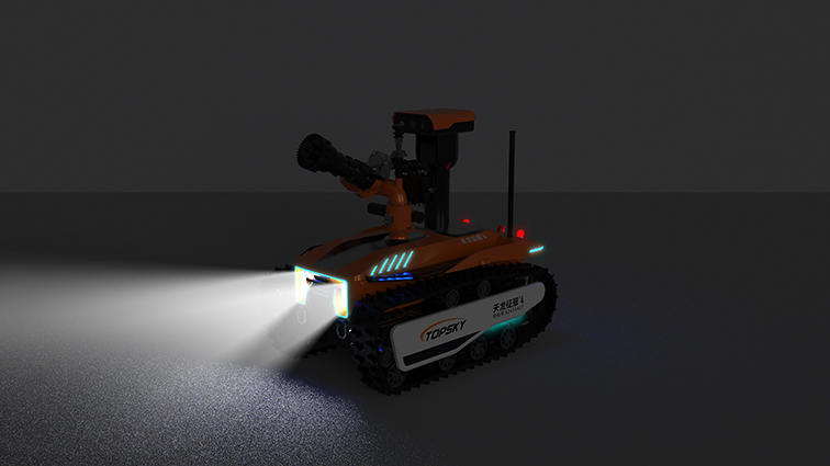 機器人采用無線遙控設(shè)計,遙控器與監(jiān)視器一體/分離,可實時的顯示電池、內(nèi)部的各種信息,機器人狀態(tài)、現(xiàn)場溫濕度、有毒有害氣體濃度報警信息等控制機器人前進、后退、轉(zhuǎn)向等運動。具備遠程偵察能力,機身搭建升降云臺、高清攝像頭、熱成像攝像頭、氣體傳感器三類環(huán)境感知設(shè)備和云臺控制設(shè)備,也可聯(lián)動聲光報警模塊提醒消防人員或群眾,有效避免危險。在通過遠程偵察手段有效獲取現(xiàn)場火源信息后,機器人配備的大功率電機可以幫助消防人員將消防水袋拖拽至危險火源區(qū)域進行滅火,并能搭載各類國內(nèi)、外的多種消防水泡,并能夠遠程控制發(fā)射水或泡沫。基于所配備的拾音模塊和揚聲器模塊,拾取現(xiàn)場環(huán)境聲音,即使消防官兵未靠近消防現(xiàn)場也能夠聽到搜救現(xiàn)場的群眾呼救聲,并通過揚聲器模塊與群眾進行現(xiàn)場對話。