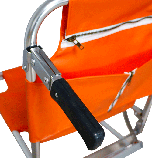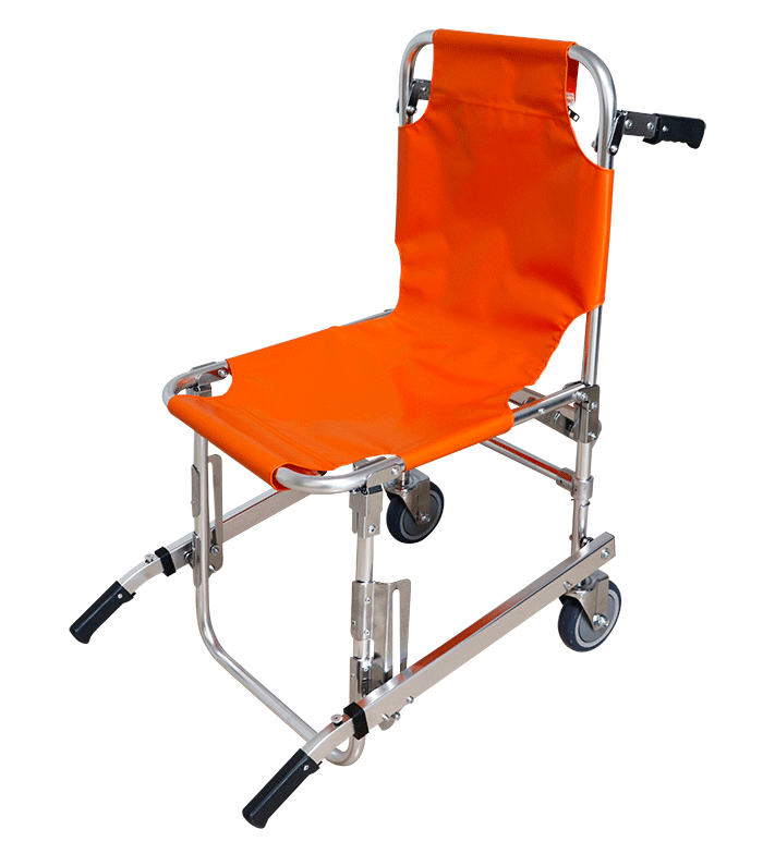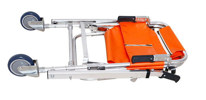 可折疊式結構便于攜帶,用于救護骨折患者上下樓道之用。產品配備寬型保險帶,以保證病人在轉移過程中的安全擔架設有兩個輪子,方便于在地面的移動。擔架靠背后端設有加強把手,可承受更多重量。