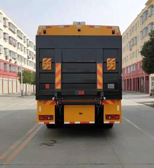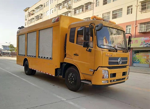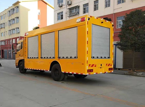 廂體外部鋼材為優質冷軋鋼板,內襯優質冷軋鋼板折彎骨架,工藝先進,強度牢固。廂體為全密封結構,具備運輸、防雨、防腐、防火、防銹要求。車廂尾部安裝鋁合金卷簾門。發電機組進排風消聲處理,消聲器做降噪處理。車廂水泵兩側設開門,發電機進風口和排風口防雨百葉窗,工作門下,尾部設有隱藏式抽拉梯,與車廂底板框架連接。