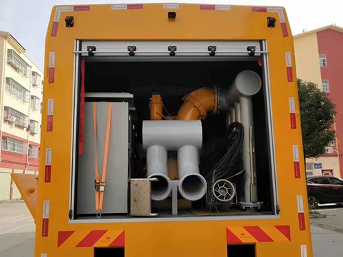 配備一臺一體式真空輔助自吸排污泵,流量1500m3/h,電機功率90kw,揚程14m,吸程8m,安裝在車輛尾部,方便拆卸水管及出水。該泵無需灌水,無需額外增加水環泵輔助抽真空,性能好,出水快。水泵啟動采用軟啟動