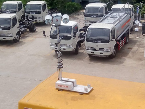 車廂后頂部安裝升降照明燈,燈具功率150×2=300W;光源形式 LED燈(二聚光、二泛光);燈桿舉起高度1800mm水平旋角 360°;垂直旋角 330