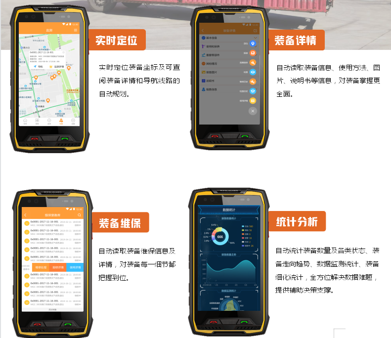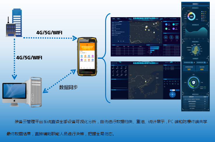 應(yīng)急消防裝備云管理平臺(tái)系統(tǒng)能夠直接通過(guò)職能人員手持的防爆終端,直接讀取系統(tǒng)內(nèi)所有的裝備、設(shè)備及具體的詳情、圖片、位置、傳輸?shù)臄?shù)據(jù),根據(jù)裝備具有特性進(jìn)行實(shí)時(shí)在線監(jiān)測(cè),當(dāng)監(jiān)測(cè)到的數(shù)據(jù)超標(biāo)時(shí),實(shí)時(shí)進(jìn)行報(bào)警及查閱報(bào)警信息。該平臺(tái)系統(tǒng)能夠結(jié)合智能防爆終端本身功能、北斗定位/GPS定位、錄像、拍照等進(jìn)行信息存儲(chǔ),隨時(shí)隨地查閱裝備庫(kù)、維修庫(kù)、報(bào)廢庫(kù)等級(jí)占比利用率分析,最終進(jìn)行數(shù)據(jù)統(tǒng)計(jì)分析處理。此外該系統(tǒng)支持本地化業(yè)務(wù)拓展,如:現(xiàn)場(chǎng)監(jiān)控、無(wú)線打印,保障此平臺(tái)系統(tǒng)在不同環(huán)境中的應(yīng)用與融合。